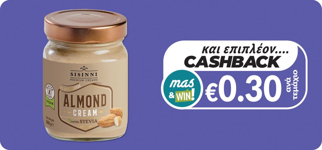 Επωφελείστε επιστροφή χρημάτων €0.30 με κάθε αγορά του προϊόντος SISINNI Κρέμα αμυγδάλου με στέβια 380g