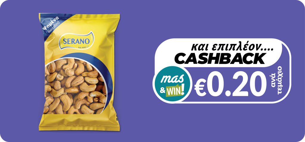 Επωφελείστε επιστροφή χρημάτων €0.20 με κάθε αγορά του προϊόντος SERANO Κάσιους ψημένα 200g