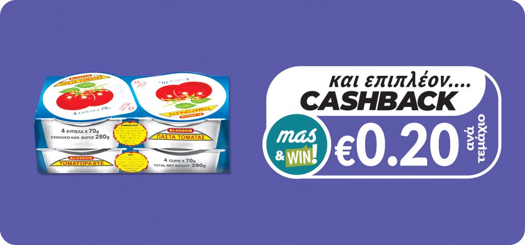 Επωφελείστε επιστροφή χρημάτων €0.20 με κάθε αγορά του προϊόντος BLOSSOM Ντοματόπαστα 4x70g