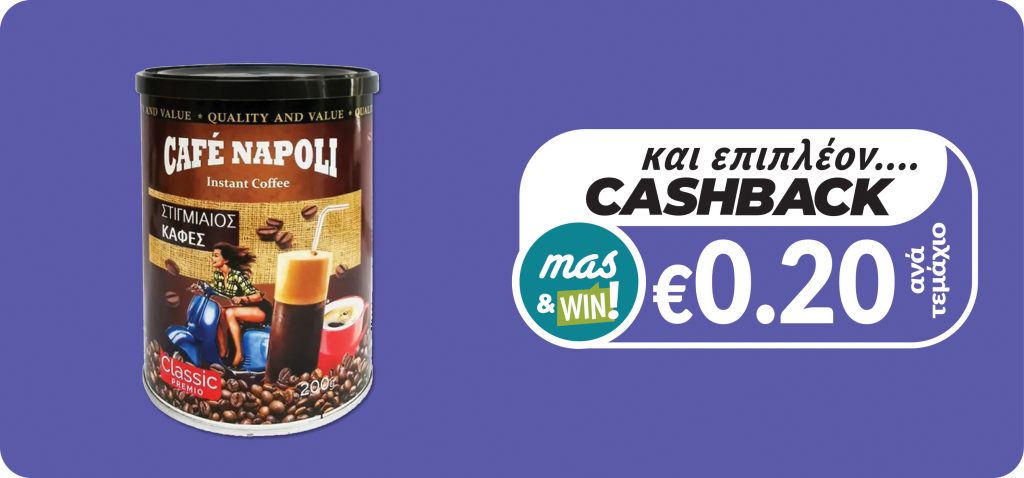 Επωφελείστε επιστροφή χρημάτων €0.20 με κάθε αγορά του προϊόντος CAFE NAPOLI Στιγμιαίος καφές 200g