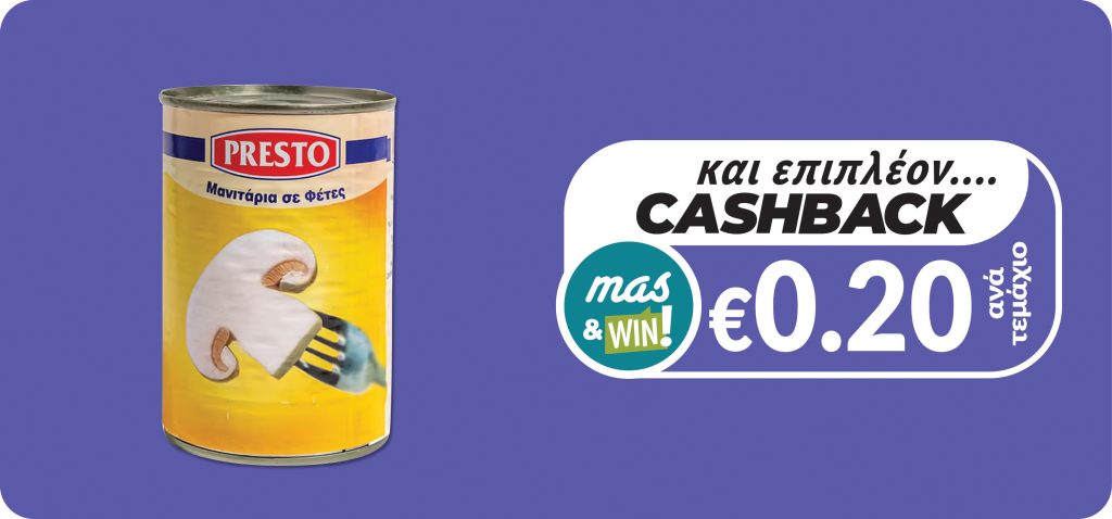Επωφελείστε επιστροφή χρημάτων €0.20 με κάθε αγορά του προϊόντος PRESTO Μανιτάρια φέτες 400g