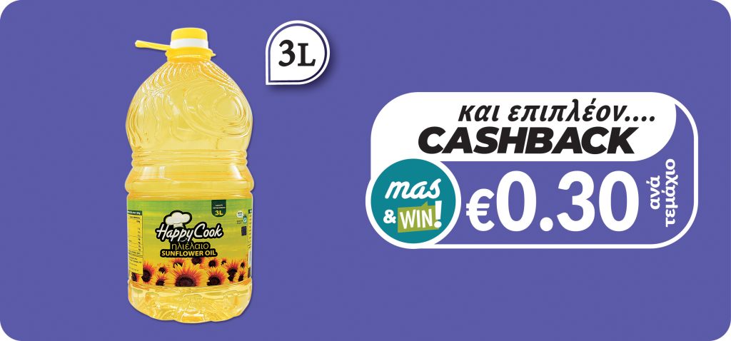 Επωφελείστε επιστροφή χρημάτων €0.30 με κάθε αγορά του προϊόντος HAPPY COOK Ηλιελαίο 3L