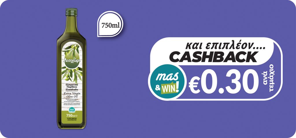 Επωφελείστε επιστροφή χρημάτων €0.30 με κάθε αγορά του προϊόντος ΛΙΟΧΩΡΙ Ελαιόλαδο έξτρα παρθένο 750ml