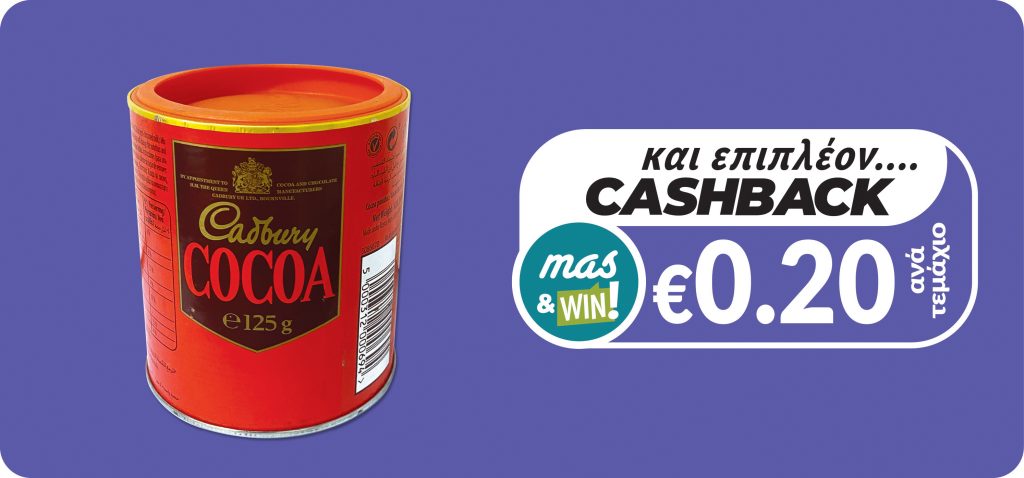 Επωφελείστε επιστροφή χρημάτων €0.20 με κάθε αγορά του προϊόντος CADBURY Κακάο σκόνη 125g