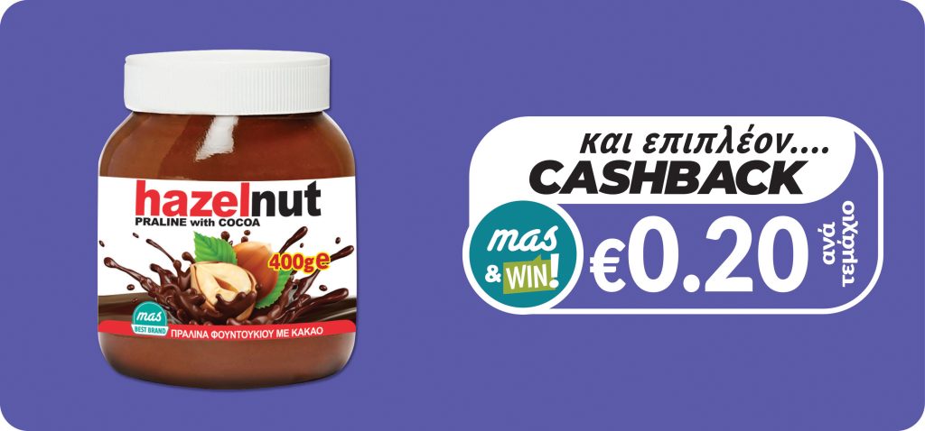 Επωφελείστε επιστροφή χρημάτων €0.20 με κάθε αγορά του προϊόντος MAS BEST BRAND Πραλίνα φουντουκιού με κακάο 400g