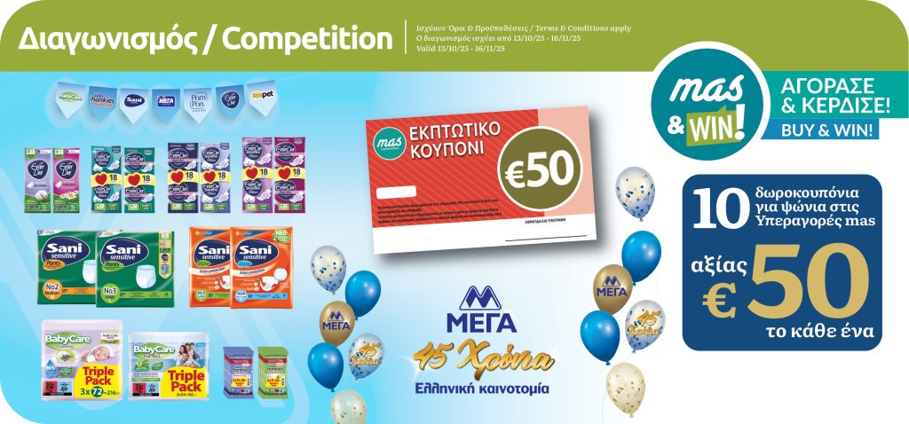 With every purchase of any EVERYDAY, BABYCARE, WET HANKIES, SANI, POM PON, RISPET, SAFENIGHTS & TIPERS products, with the use of mas&WIN!, you enter the draw for a chance to win one of the 10 VOUCHERS for your shopping at Mas Supermarkets worth of €50 each.