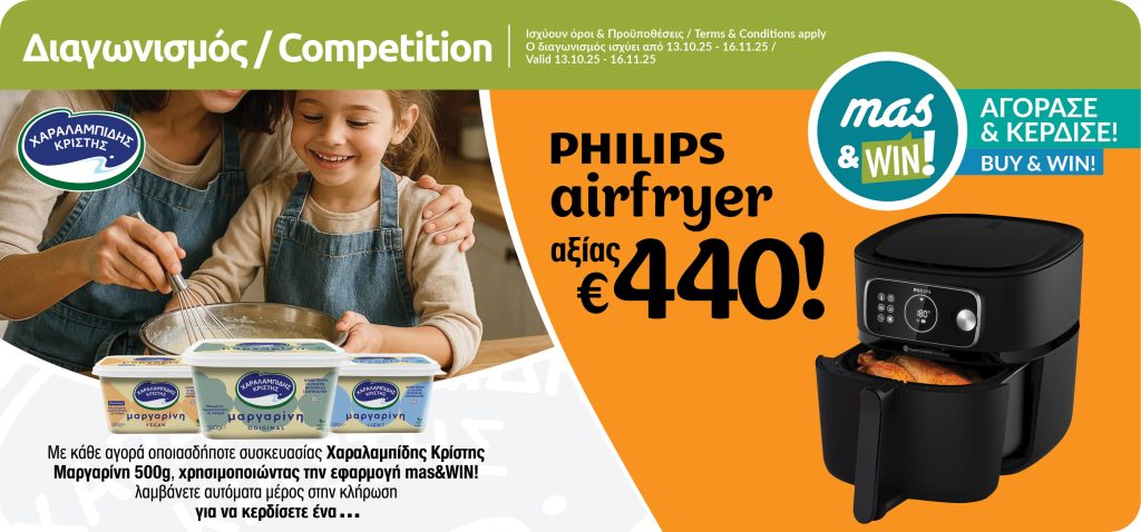 With the purchase of any CHARALAMBIDES CHRISTIS Margarine 500g, with the use of mas&WIN!, you enter the draw for a chance to win one PHILIPS Air Fryer worth of €440.