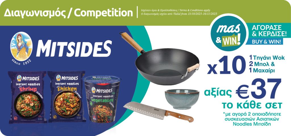 With the purchase of any 2 MITSIDES Noodles, with the use of mas&WIN!, you enter the draw for a chance to win one of the 10 ASIAN Sets including 1 Wok, 2 Bowls & 1 Knife worth of €37 each set.
