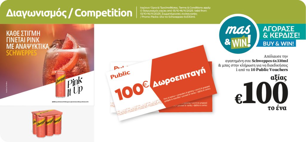 With the purchase of any multipack of SCHWEPPES 6x330ml, with the use of mas&WIN!, you enter the draw for a chance to win one of the 10 PUBLIC Vouchers worth of €100 each.