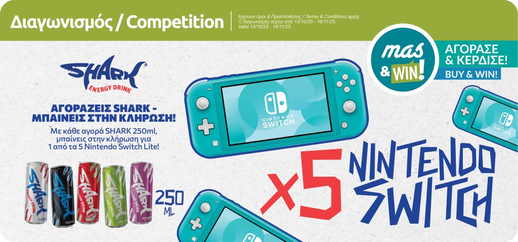 With the purchase of any SHARK 250ml, with the use of mas&WIN!, you enter the draw for a chance to win one of the 5 NINTENDO SWITCH.