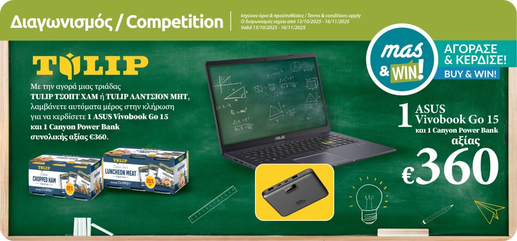 With every purchase of any TULIP 3x200g, with the use of mas&WIN!, you enter the draw for a chance to win one ASUS Vivobook Go15 Laptop along with one CANYON Power Bank worth of €360 in total.