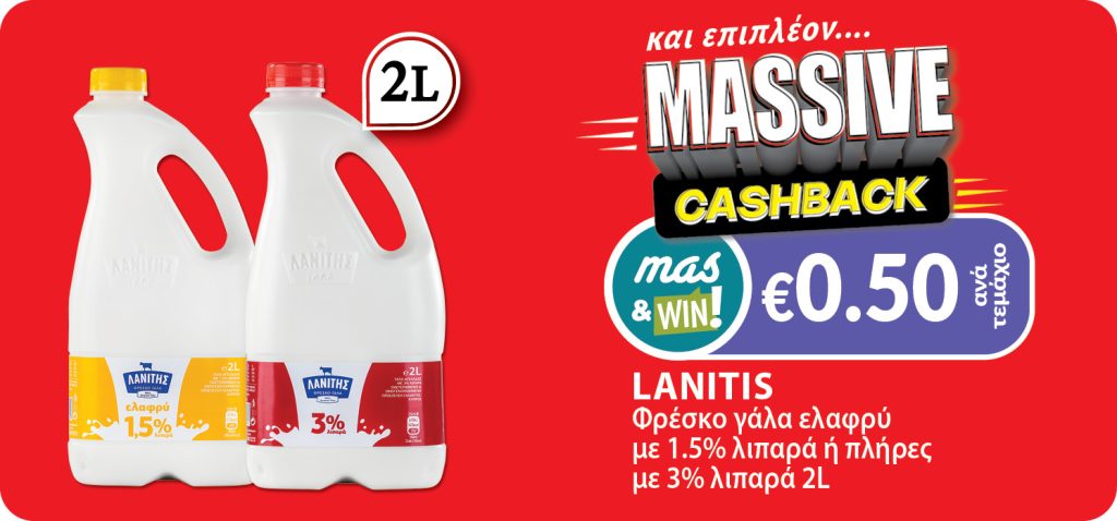 Get benefited from a refund €0.50 with every purchase of LANITIS Milk light 1.5% fat 2L or LANITIS Milk 3% fat 2L