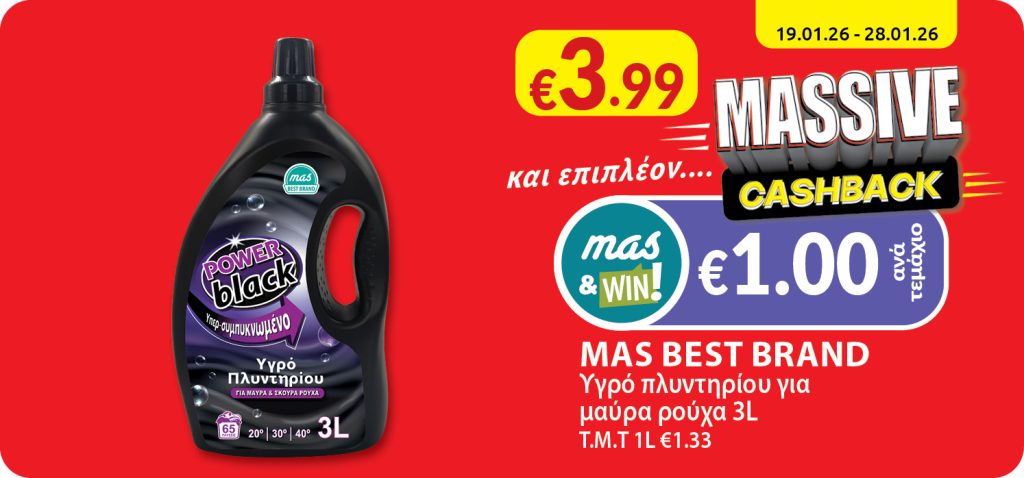 Get benefited from a refund of €1.00 with every purchase of MAS BEST BRAND Liquid detergent for black clothes 3L.