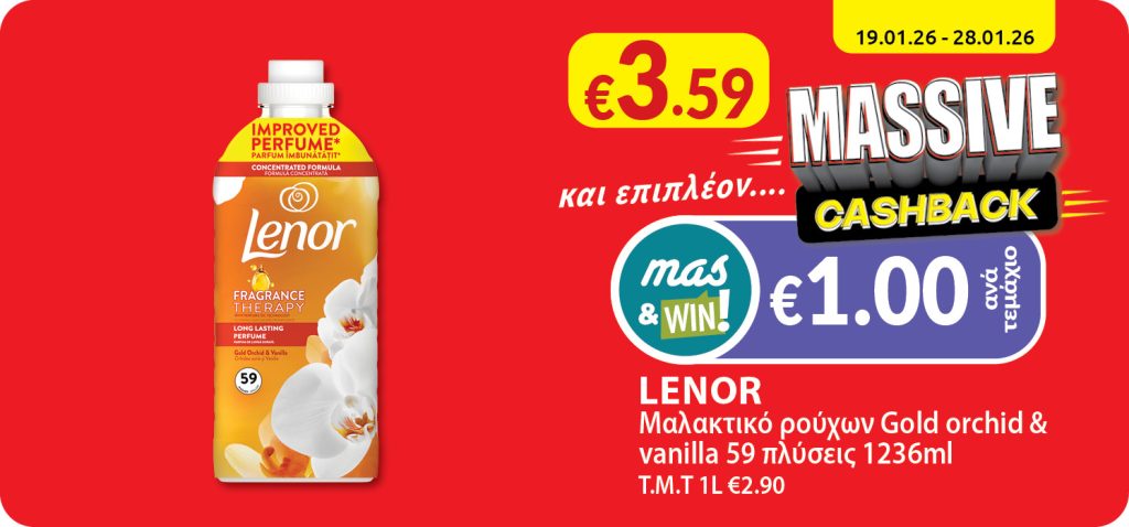 Get benefited from a refund of €1.00 with every purchase of LENOR Fabric softener gold orchid 59w 1236ml.